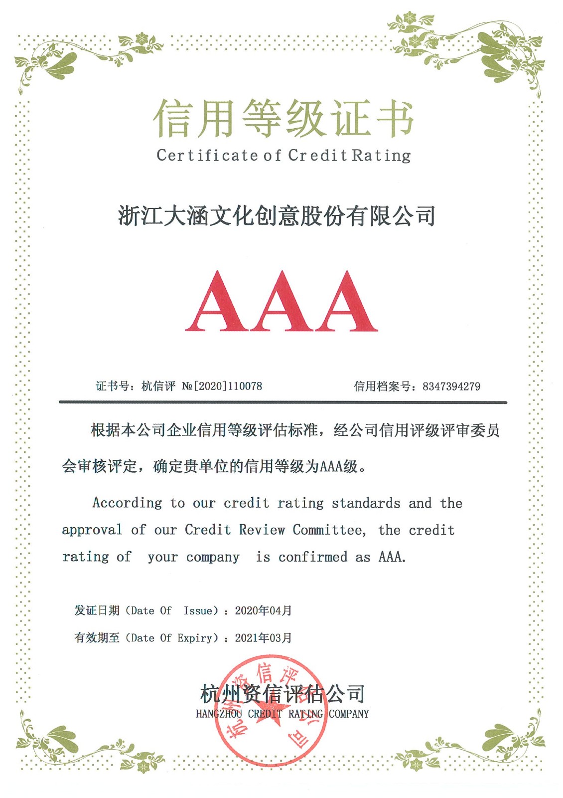 大涵荣誉